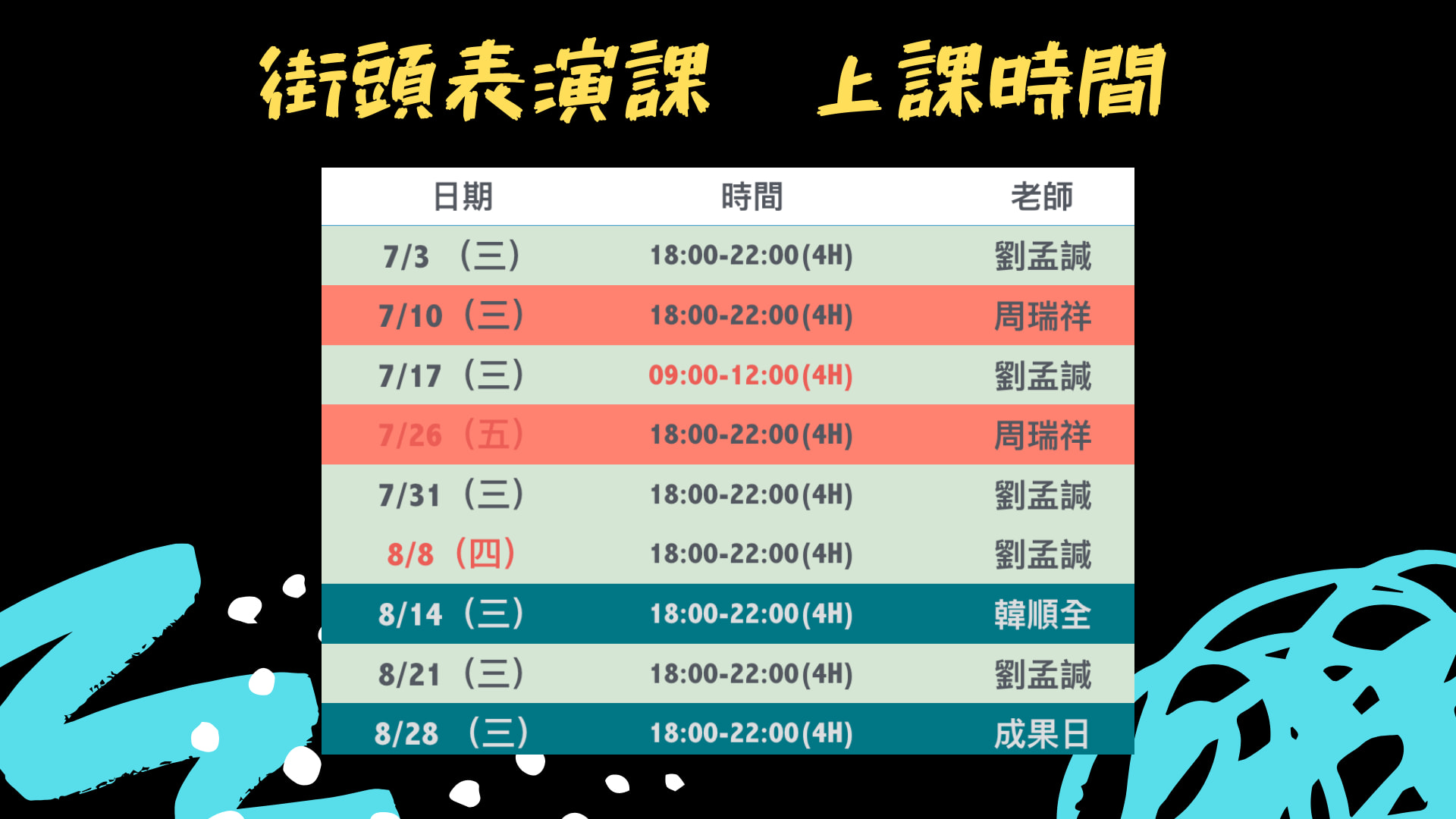 Time⎥ July & August, once a week, 18:00-22:00