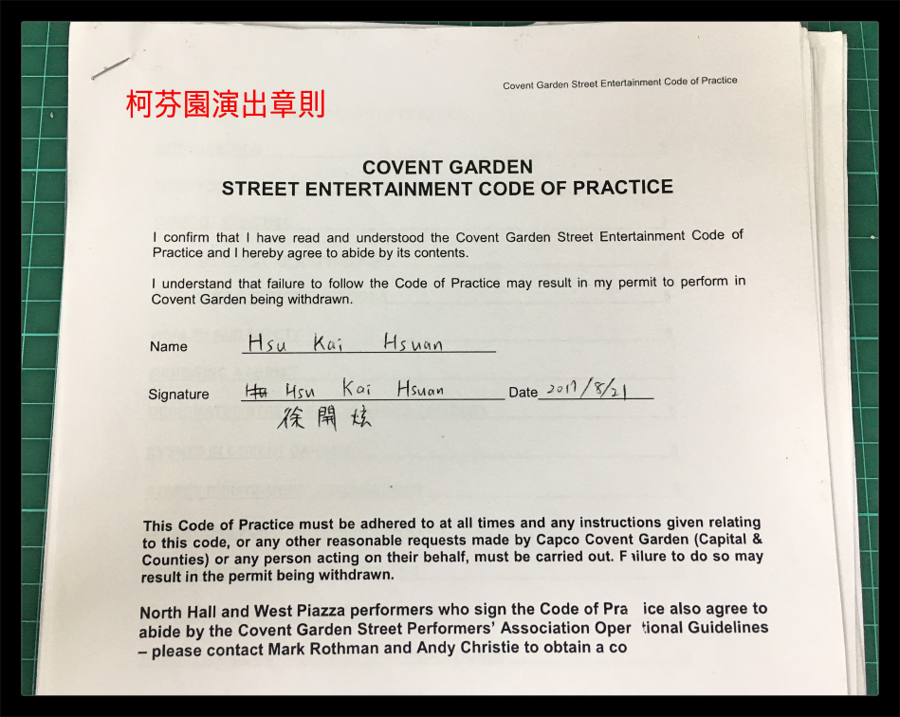 通過審核的街頭藝人,還必須向保險公司購買 1000 萬英鎊的 Public Liability Insurance (每年保費 120 – 220 英鎊),確保意外發生時可由保險公司負責觀眾與表演者人身或財物損失之賠償。