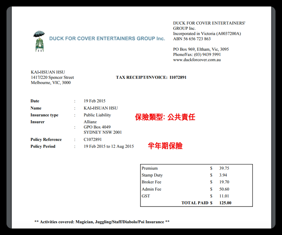 在倫敦柯芬園以及雪梨歌劇院前演出,需要購買 公共責任保險 – Public Liability Insurance