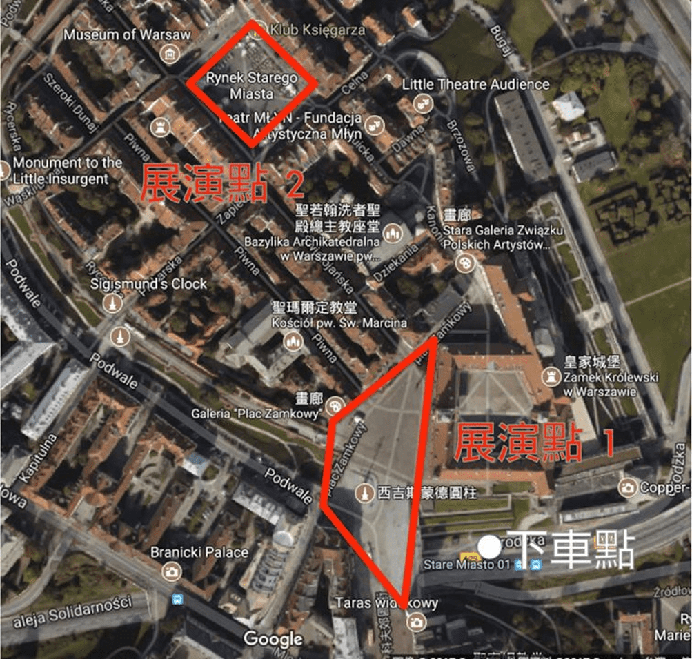 Google map 搜尋 「Kolumna Zygmunta III Wazy」,老城區是華沙的著名觀光景點,屬行人徒步區,在此廣場內任何不影響行人動線的點都可以演出。