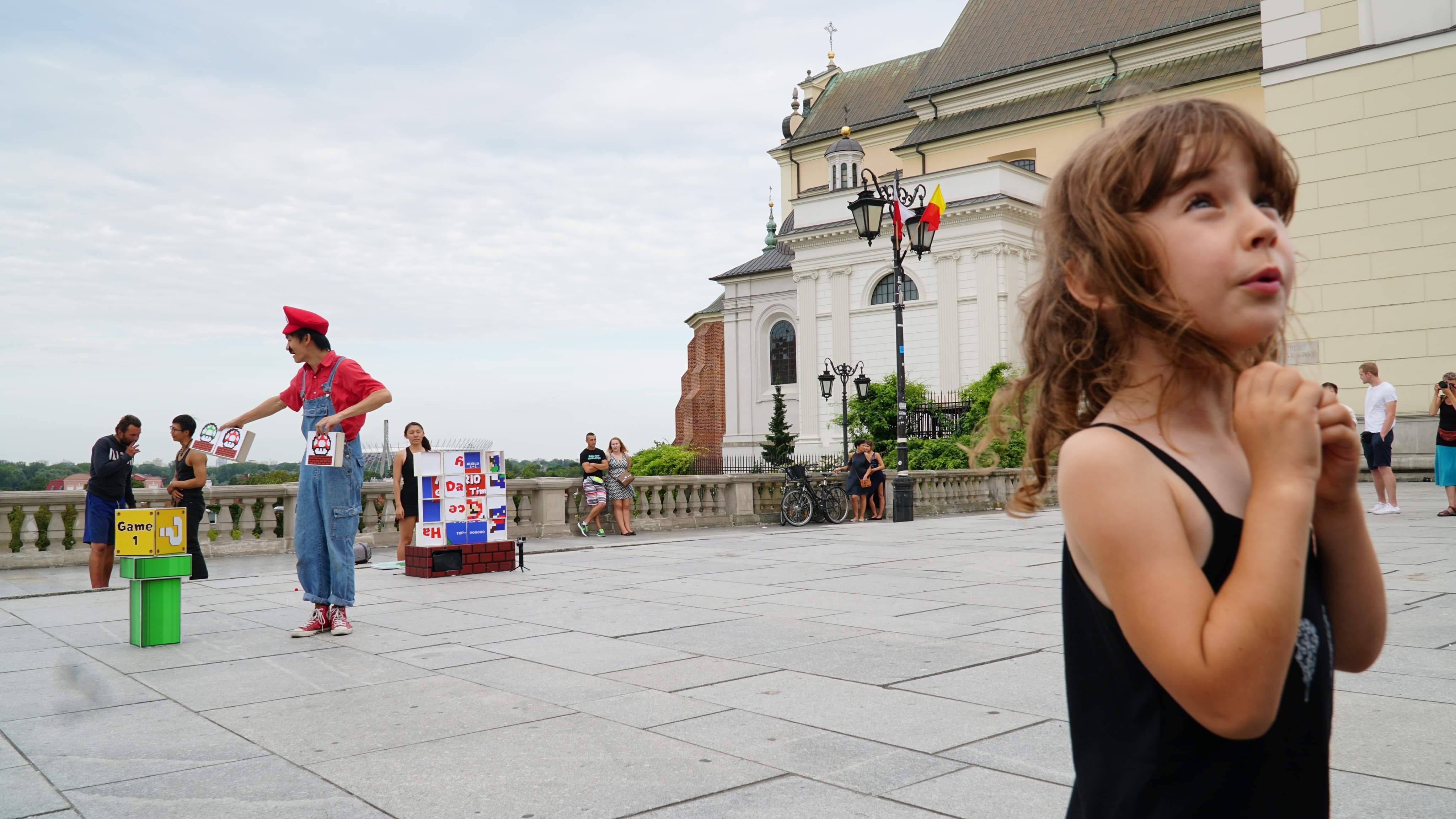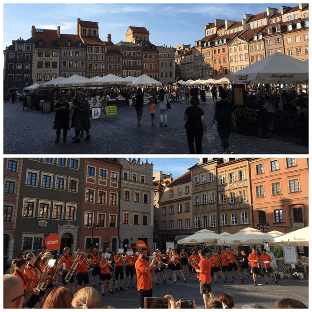 雖為觀光客出沒的展演點,但廣場非常安靜。 根據當時觀察,音樂類表演者每兩小時就更換地點演出,猜測其目的是為了不打擾附近居民的生活。傍晚五點開始人潮明顯增加 ,而波蘭夏天的日落時間是晚上8點, 故下午 5-8 點是最佳的演出時間 (晚間 10 點後禁止演出)。